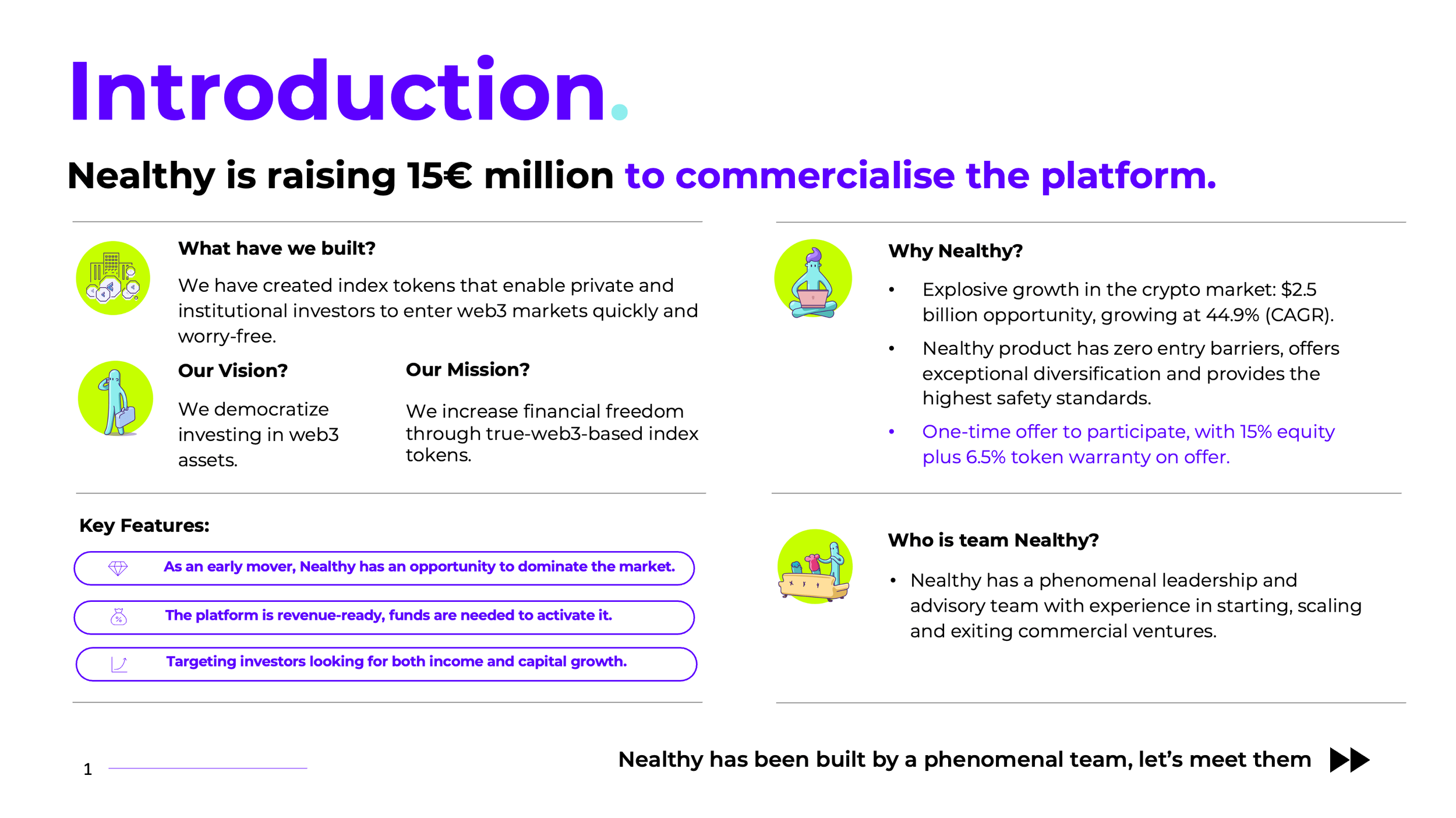 Nealthy’s platform allows anyone, anywhere, to invest in NFTs and cryptocurrencies quickly and worry-free through on-chain index products. The founders, all successful serial entrepreneurs based in Germany, worked with Decksadu to create a standard 12-slide deck for sophisticated investors and institutional investors. A minimal approach to design combined with a numbers-lead approach to storytelling was used to develop their seed round investor pitch deck.