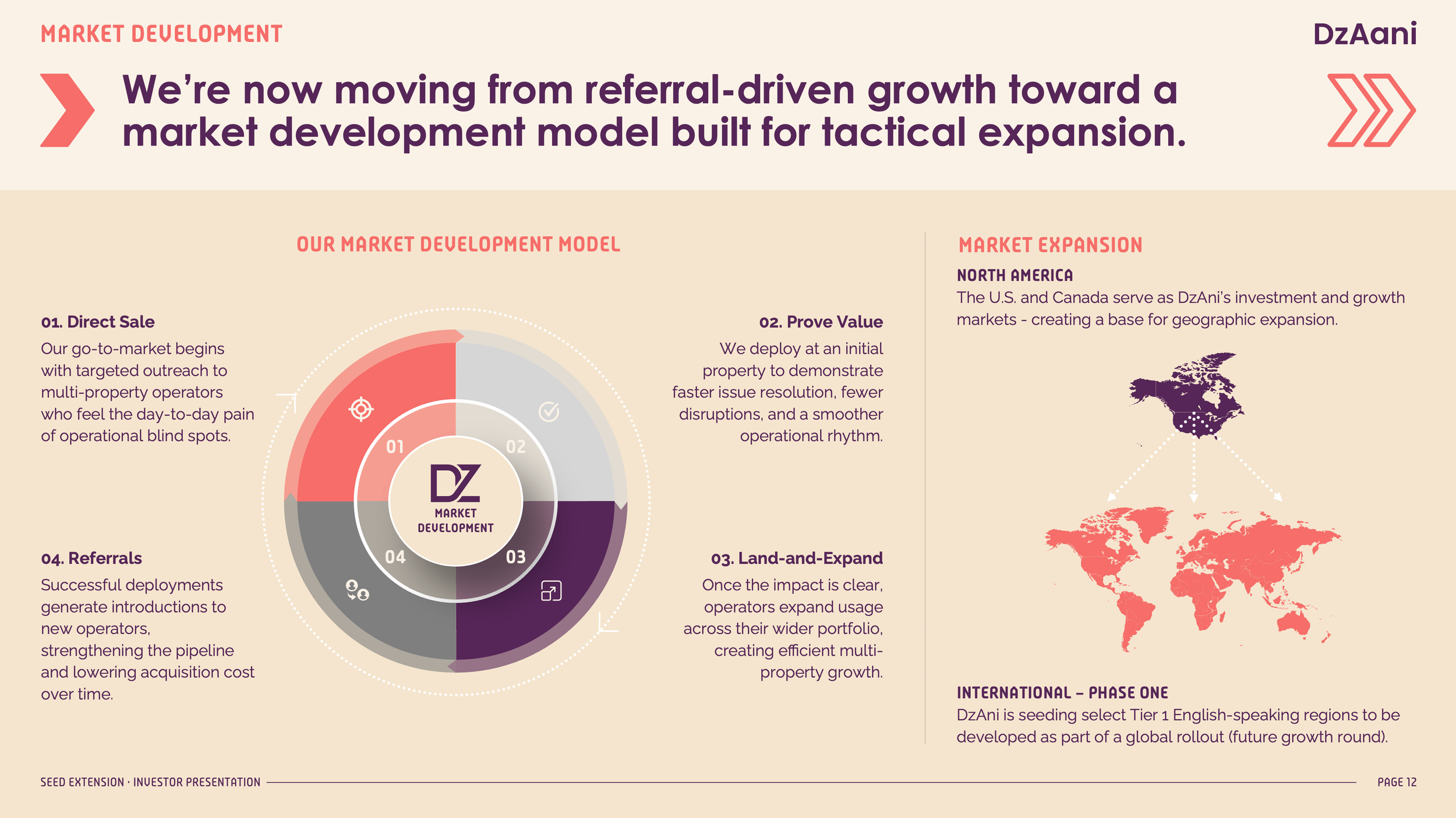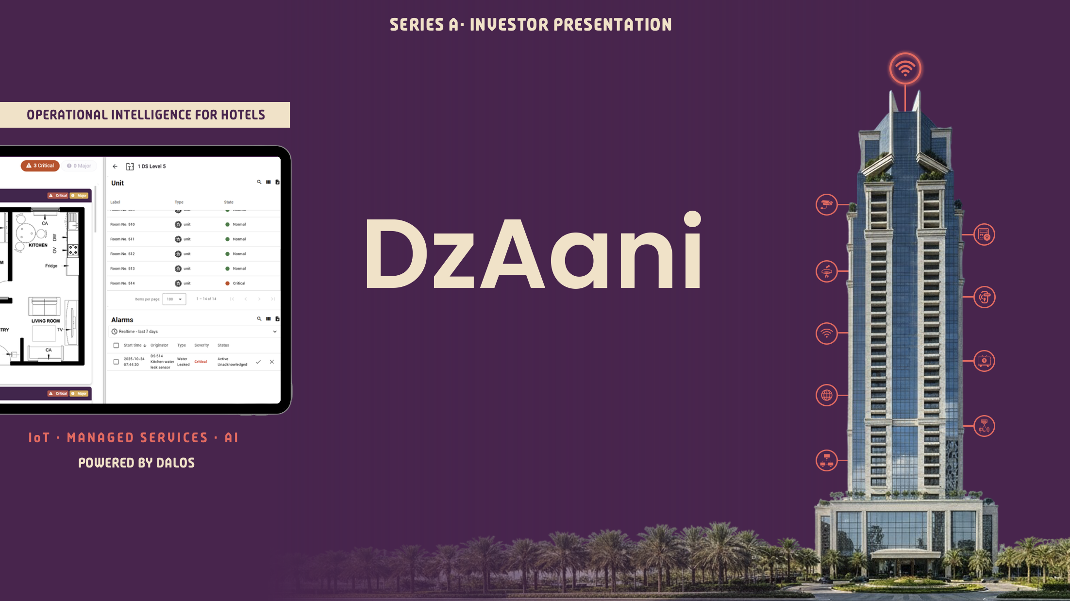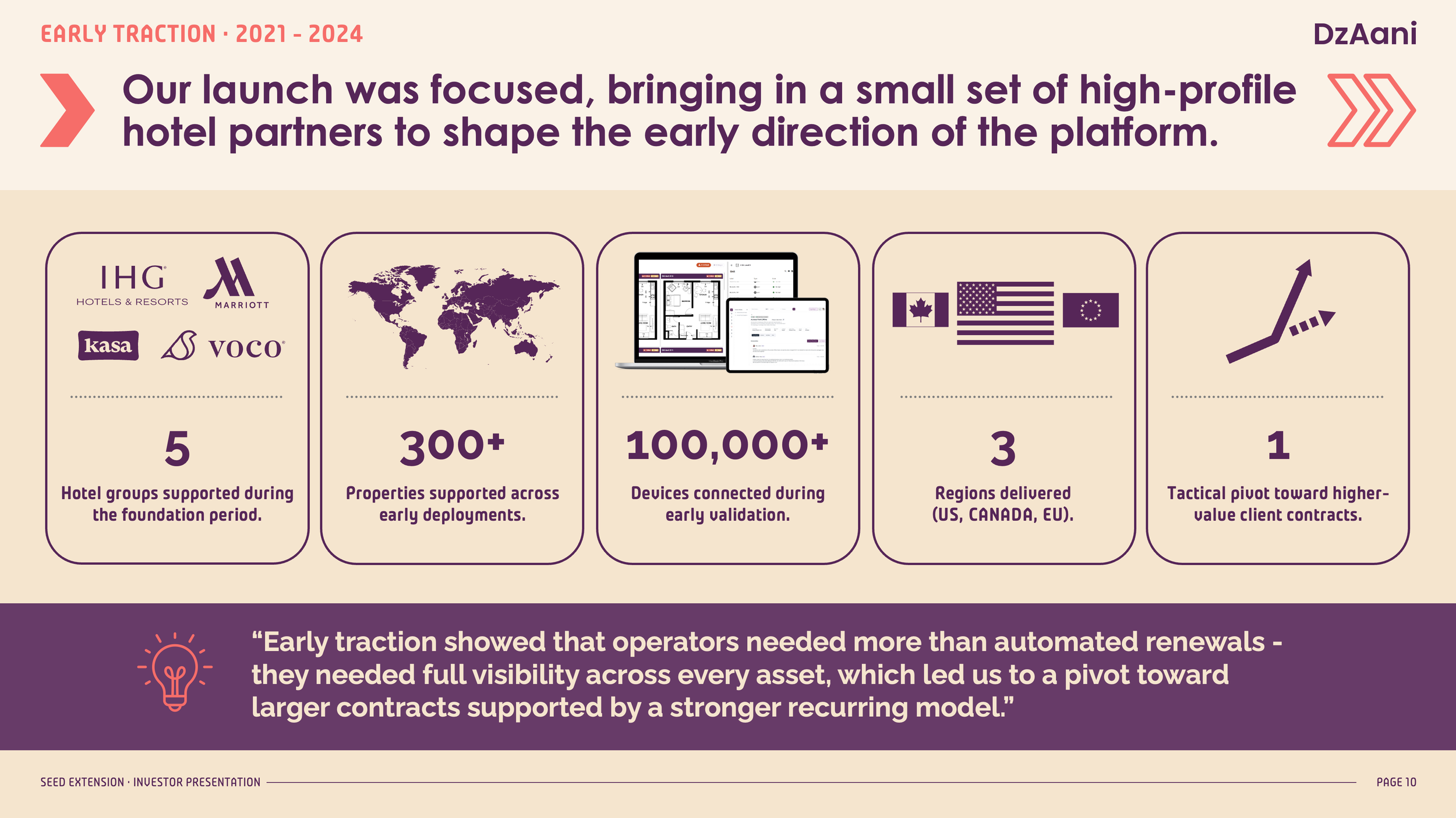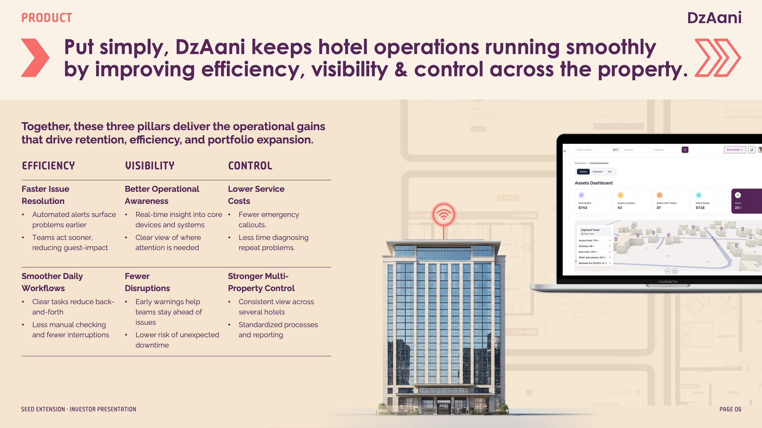 Hotels across the US and Canada run on disconnected systems - maintenance issues surface only when guests report them, vendors work in silos, and operators have no unified view of what's happening across a property. A Michigan-based hospitality tech company engaged us to build their investor presentation for a seed extension raise, having spent four years validating an IoT and managed services platform that connects the operational layer of hotels into a single dashboard. The deck covered the problem, product suite, traction across 300+ properties, business model, competitive positioning, and a land-and-expand growth strategy targeting a $1.2B serviceable market across 60,000 US hotels.