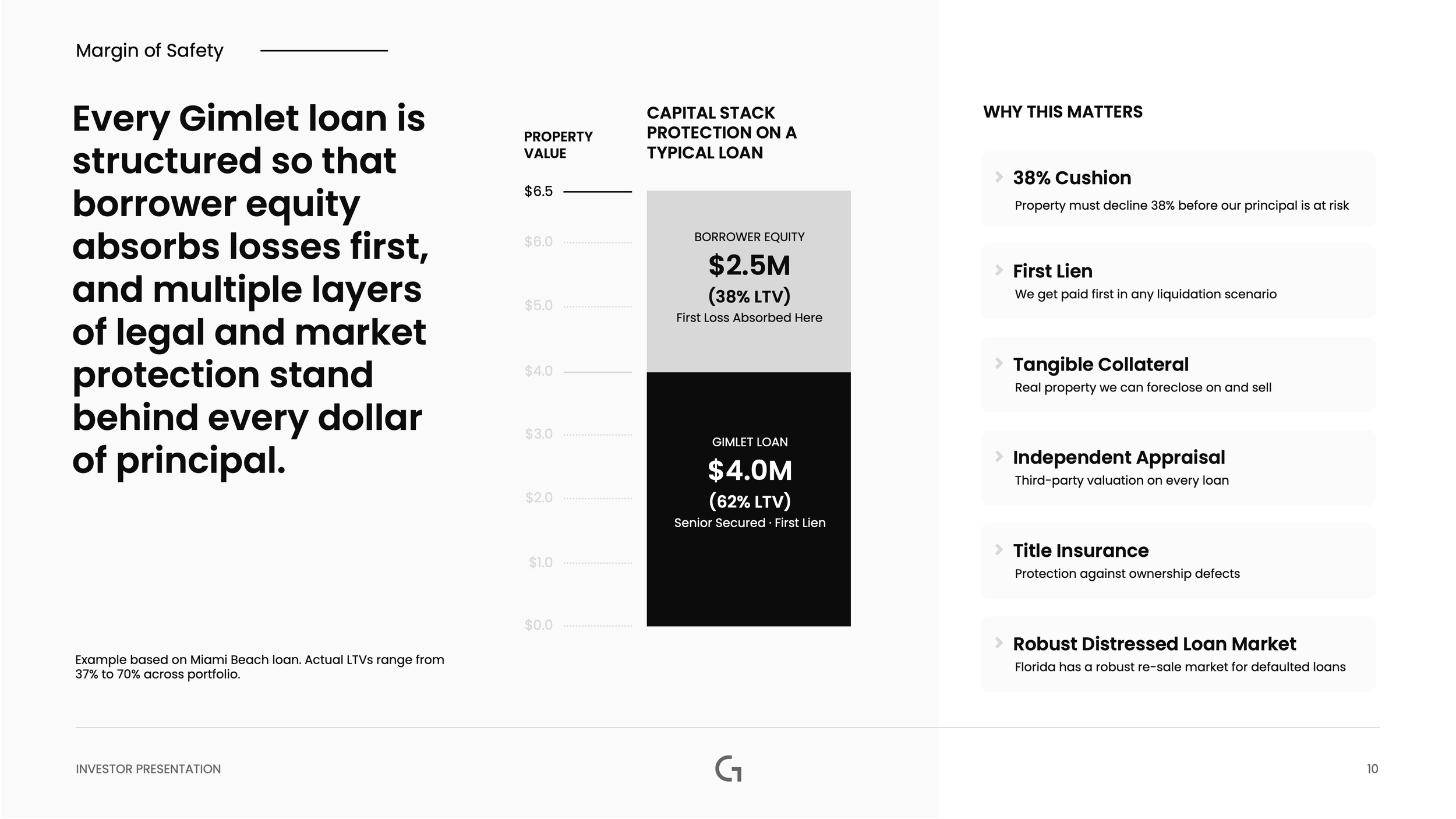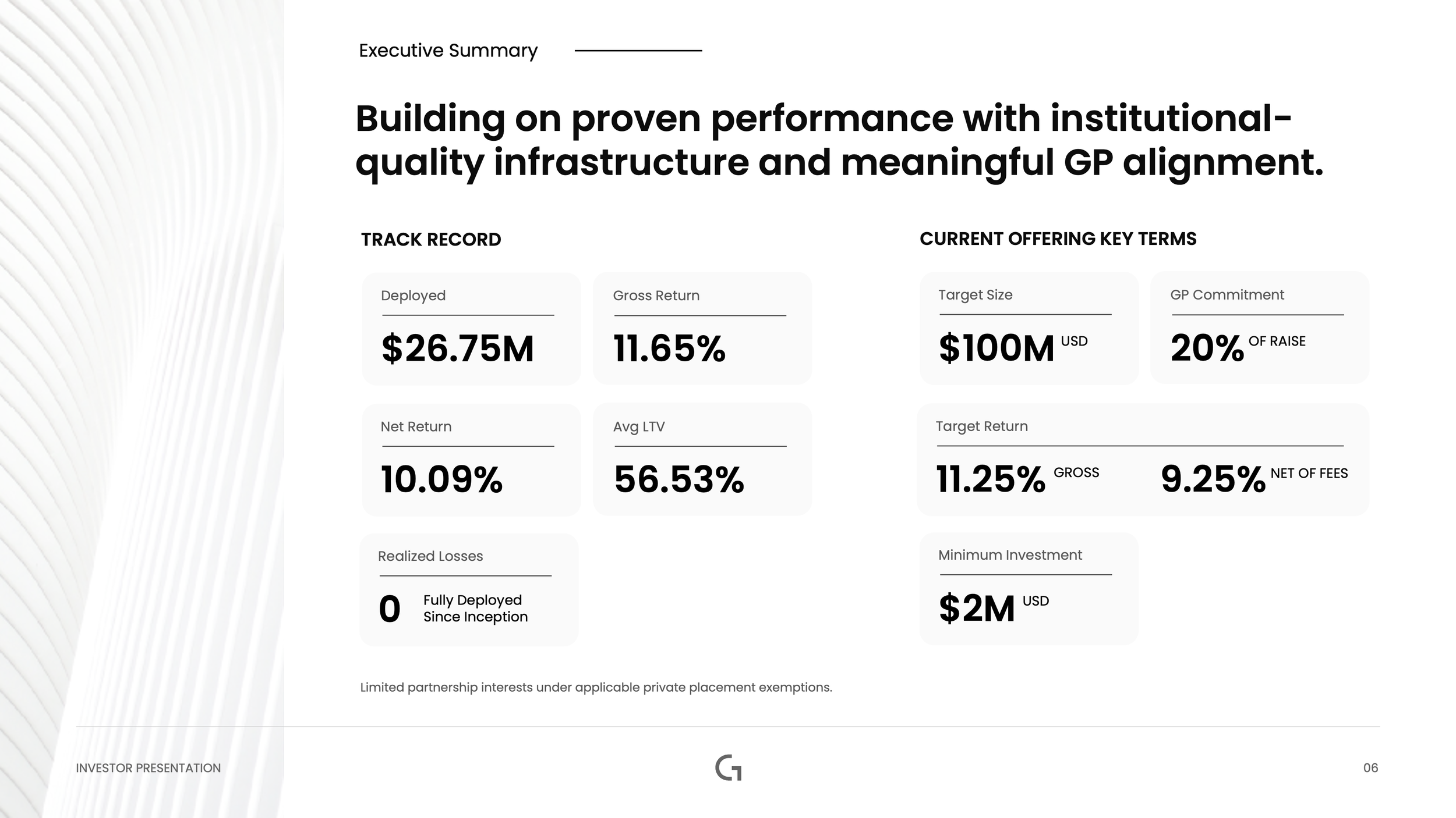 Real estate private credit funds live or die on the credibility of their underwriting discipline, and this Phase II raise needed a presentation that went beyond the numbers to show exactly how capital is protected. We built a structured investor deck covering investment thesis, loan parameters, portfolio composition, waterfall mechanics, and a workout case study. The result was a presentation that gave institutional LPs the depth and confidence they needed to commit.